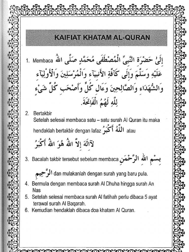 Dilansir dari laman NU Online proses khatam ini tidak hanya menyelesaikan semua bacaan surah dalam Alquran saja. 8 Adab Membaca Alquran dan Keutamaannya. Kaifiat tata cara khataman Al-Quran dimulai dari pembacaan tawasul kepada Rasulullah keluarga dan para sahabatnya.